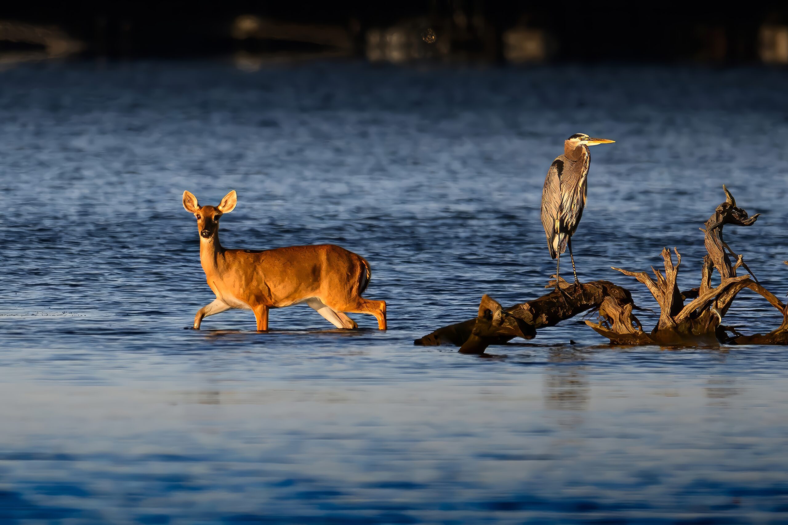 Odd Couple Enjoying the Southern Sun’s Warmth features a great blue heron undisturbed and uninterested as a white-tail deer doe crosses a shallow narrow between an island and a wooded peninsula on the shores of Lake Murray, SC during early fall.